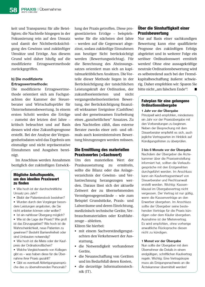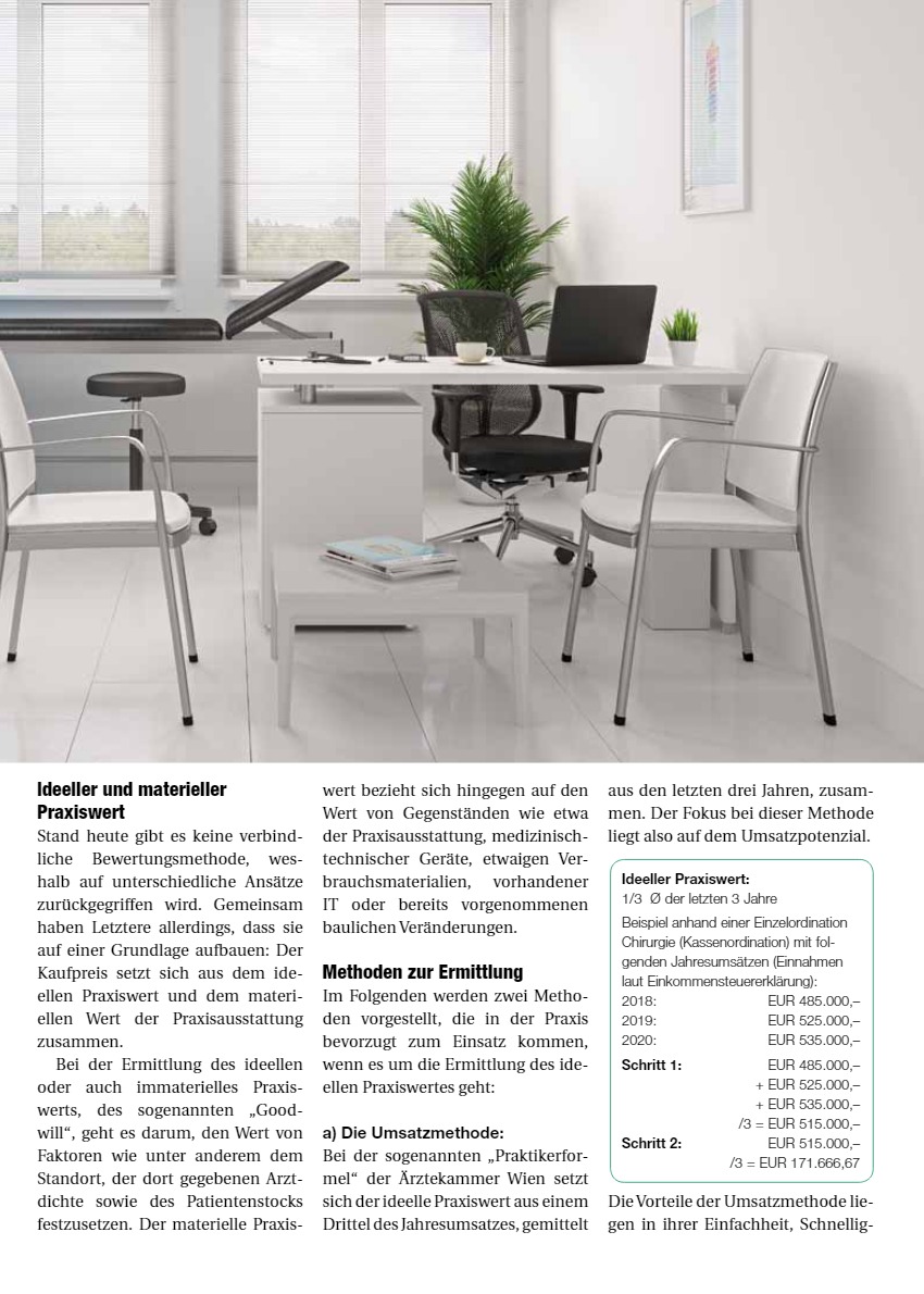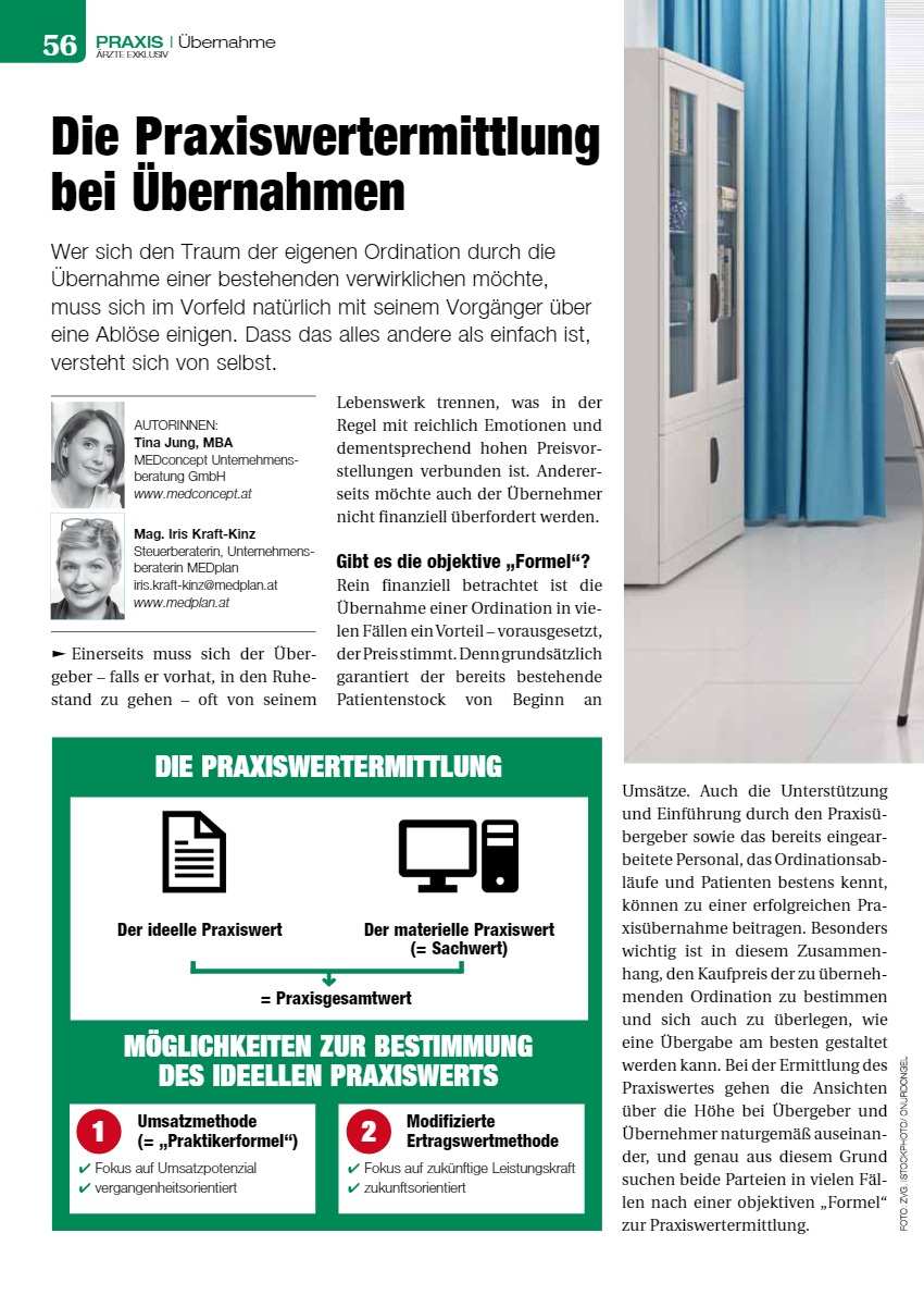 Wer sich den Traum der eigenen Ordination durch die Übernahme einer bestehenden verwirklichen möchte, muss sich im Vorfeld natürlich mit seinem Vorgänger über eine Ablöse einigen. Dass das alles andere als einfach ist, versteht sich von selbst. Im folgenden Artikel (Ärzte Exklusiv Ausgabe Juni 2021) gehen wir auf verschiedene Ermittlungsmethoden aus unseren Beratungsalltag ein.